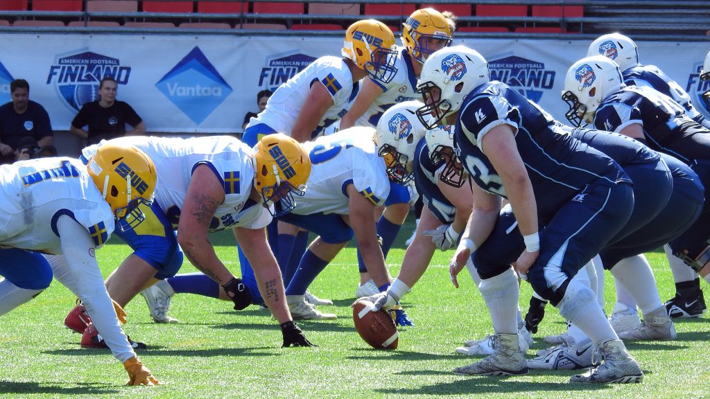 Bakom ett ruskigt effektivt passningsspel och tre TD-passningar från Miro Kadmiry kunde Finland kunde bygga upp en 19–0-ledning i halvtid av EM-semifinalen på Myyrmäki Football Stadium i Vantaa utanför Helsingfors. Detta samtidigt som Sverige inte ar med i matchen i den första halvleken. Ett ungt anfall hade svårt att flytta bollen annat är när QB:s Viktor Wessberg och Ture Nilsson själva sprang med densamma och det svenska försvaret hade stora svårigheter med att få stopp på Finlands ruskigt effektiva passningsspel.