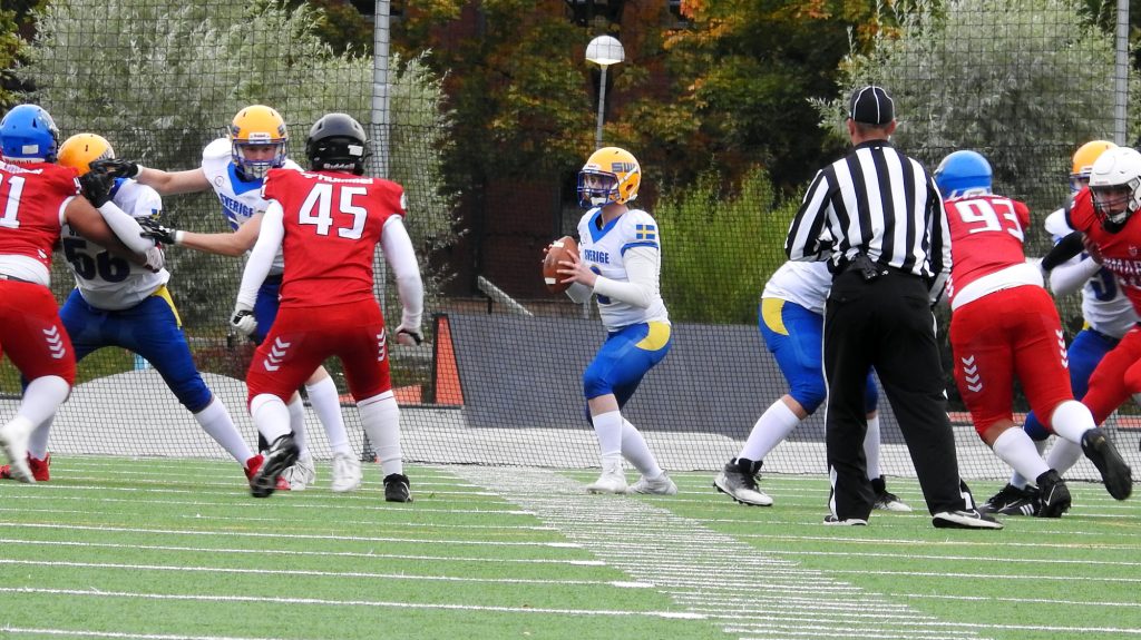 Och därefter rullar det på. Ville Bjuremar returnerar en interception ner till Danmarks 7 yardslinje och Emilio Sjöström springer in 14–0. Justin Boney returnerar en punt till Danmarks 13 yardslinje och Oscar Hardarsson sparkar in ett field goal fram till 17–0. Danmarks misslyckas med en punt och Jacob Järnesund springer in 24–0. Edgar Wallén tar vara på de luckor som Sveriges offensiva linje skapar och springer 47 yards och utökar Sveriges ledning till 31–0. Och allt detta händer innan den första kvarten är över.