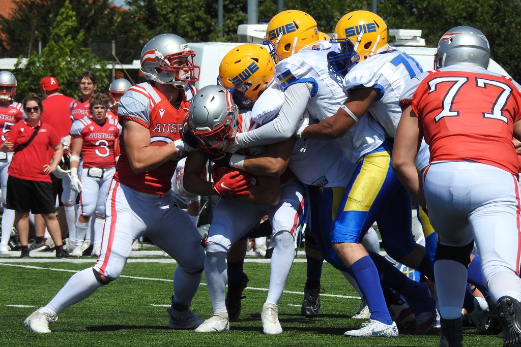 Sveriges anfall hade det tuffare. Oliver Lundberg blixtrade till och sprang 20 gånger för 85 yards, Elliot Lindehammer tog emot två passningar för 67 yards, Max Lambert tryckte in Sverige enda touchdown och Rasmus Frick sparkade in ett 30 yards långt field goal. Men ett duktigt försvar i Österrike gjorde det svårt för Sverige.