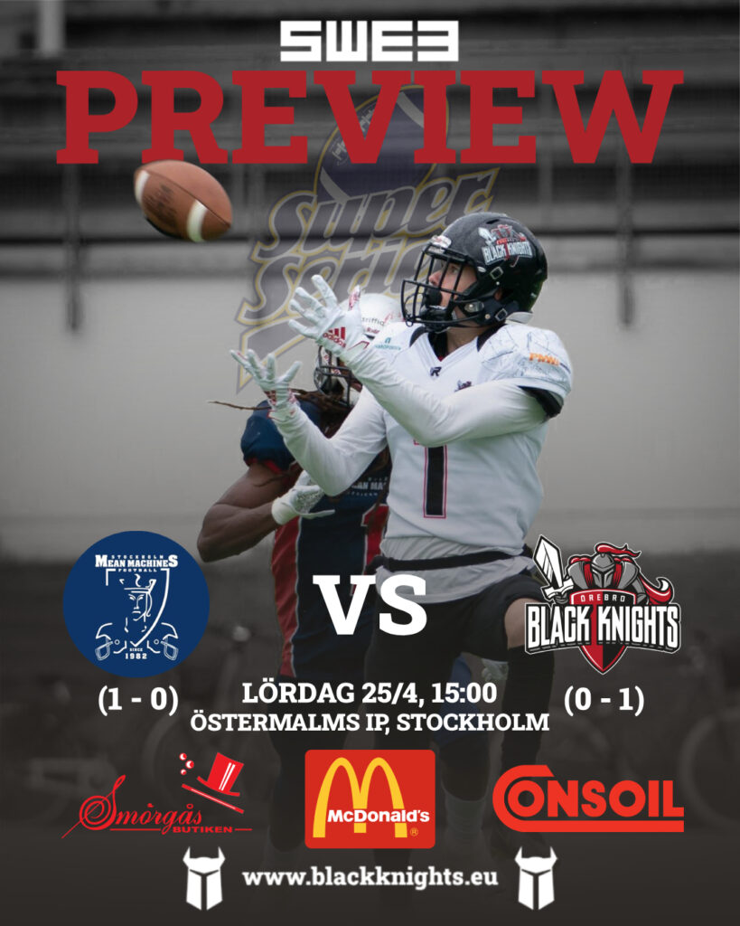 Örebro Black Knights hade en jobbig match med tidiga skador i försvaret i premiär mot Carlstad Crusaders. I sin preview inför matchen skriver man hur laget måste hitta en lösning för att stoppa Mean Machines springspl med med David Ottander. Både Stockholm och Örebro ser ut att slåss om slutspelsplatserna och vinnaren i denna match har en stor fördel i slutspeltsracet skriver Örebro i sin preview.